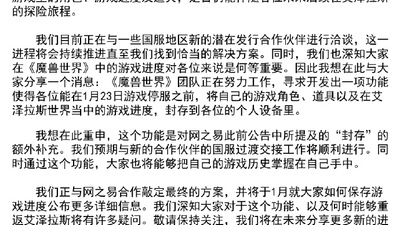 魔兽世界魔兽制作组总经理 John Hight 致所有《魔兽世界》国服玩家的公开信,表示正在与潜在合作伙伴进行洽谈。项目组也在开发新功能,可以使玩家将自己的角色、道具、游戏进度封存至个人设备中。