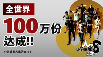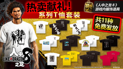 如龙为庆祝《人中之龙》全球销量突破100万,世嘉推出「热卖大礼!免费T恤套装」,共计有11件T恤可在游戏中更换。