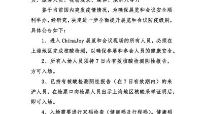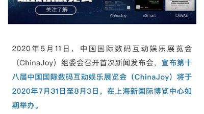 ChinaJoyChinaJoy官方发布公告,原定于2022年7月29日-8月1日在上海新国际博览中心举办的第二十届中国国际数码互动娱乐展览会(ChinaJoy)线下展宣布延期举办。同时,线上展将于8月27-9月2日...