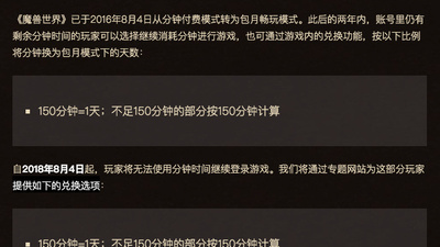 魔兽世界《魔兽世界》官方宣布自8月4日起玩家将无法使用分钟时间继续登录游戏,仍有剩余分钟时间的玩家将可通过专题网站把时间兑换为暴雪游戏点数或月卡。
