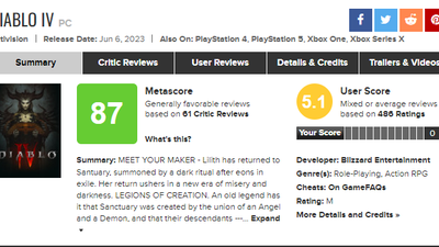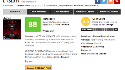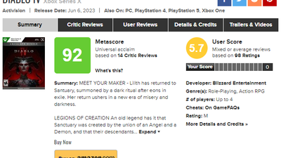 暗黑破坏神metacritic 开放了《暗黑破坏神4》的玩家评价。游戏的 PS5、XSX、PC 三个版本的用户得分均未超过6分(满分10),而对应版本的媒体评分为 88、92、87(满分100)。不少给出低分评...