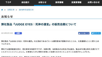 审判之眼:死神的遗言《审判之眼》中饰演羽村京平的日本演员泷正则近日因涉嫌吸食可卡因被警方逮捕。受此事件影响世嘉从昨日起紧急停止了《审判之眼》的宣发和出货。今日《如龙》工作室制作人佐藤大辅发推表示:“不会让《审判之眼》就此...