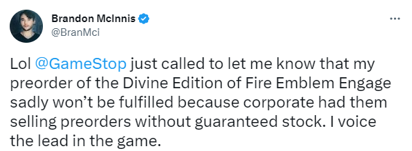 火焰纹章配音演员 Brandon McInnis 在《火焰纹章 Engage》中为主角配音。他在 GameStop 预购了游戏的豪华版,但随后被砍单。原因是商家在没有库存保证的情况下大量预售,导致了供不应求。...