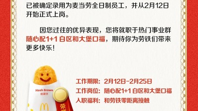 麦当劳薯饼将在2月12日-2月25日全天供应