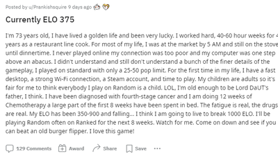 帝国时代在 reddit 论坛上的《帝国时代2》版块,一名玩家正在向其他人“下战书”。这是一名73岁高龄的玩家,并且罹患癌症。他写帖子中写到:“我73岁了,曾幸运地度过了一段黄金岁月。年轻时,我在餐厅里每周工...