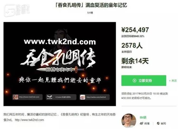 春节前,一个名为《吞食孔明传》的游戏出现在众筹社区“摩点网”。项目发起者“Mr晴”重制了Capcom于1991年发售的FC游戏《吞食天地2:诸葛孔明传》,预计登陆PC平台,并出现在Steam的青睐之光中。