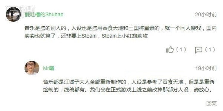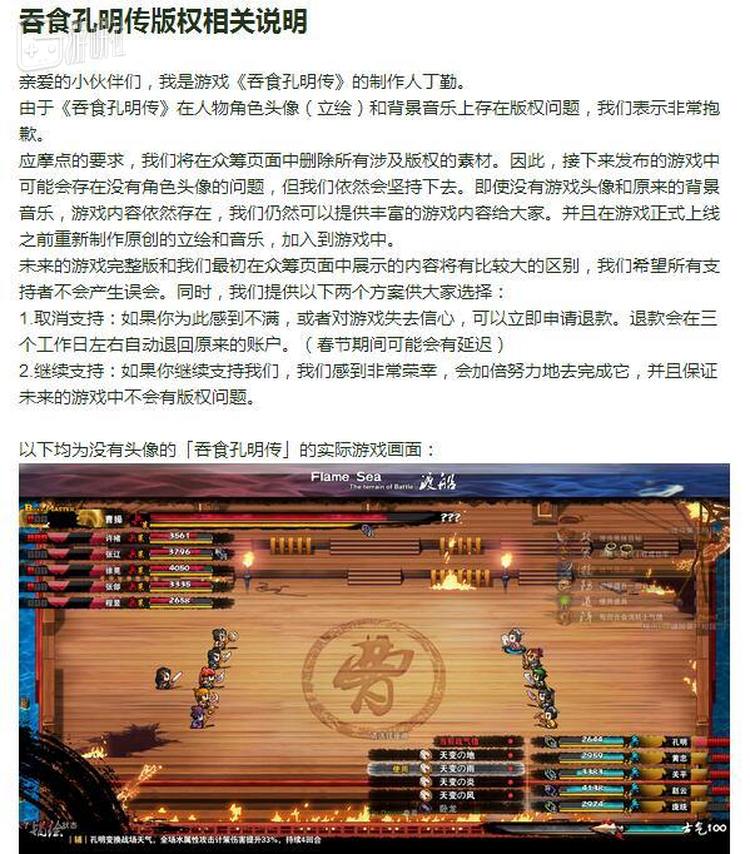 随着关注人数的上升,围绕《吞食孔明传》素材侵权的质疑越来越烈,在摩点、微博和知乎都引起了不少讨论。之后该游戏在Steam绿光下架,众筹平台也与开发者进行了交涉。