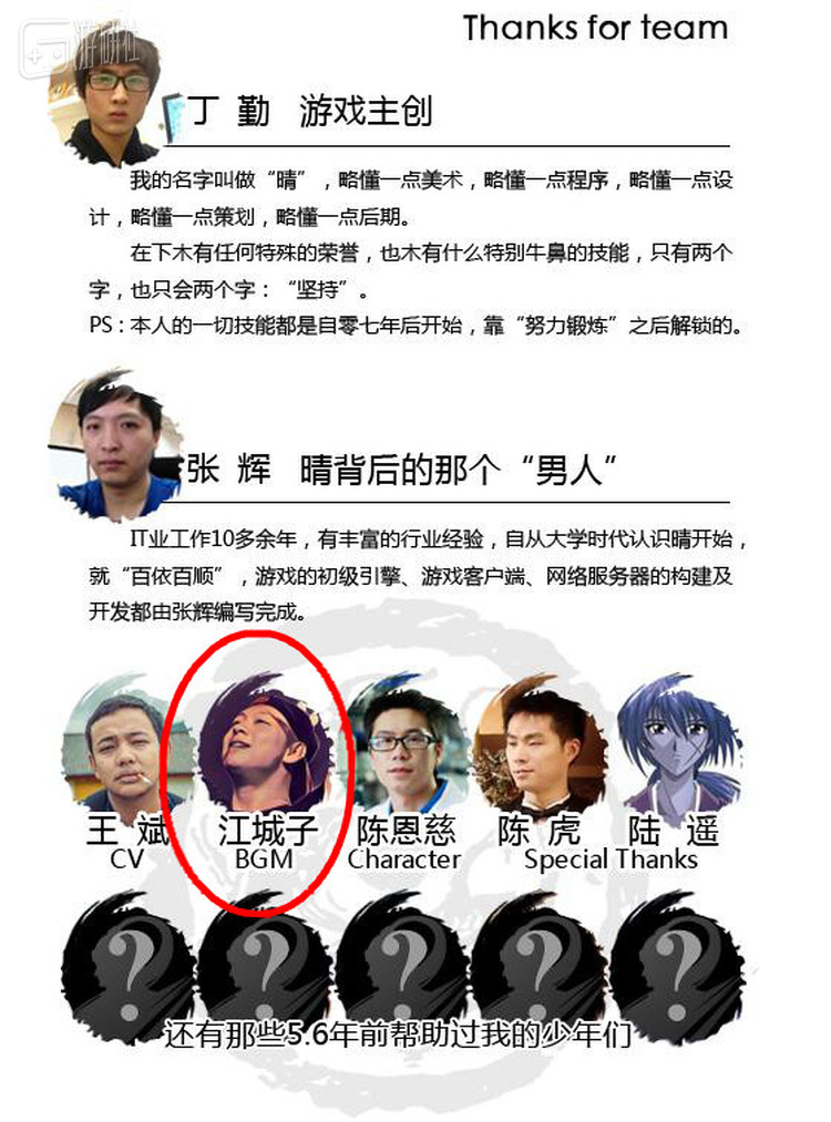 众筹页面的最后部分是游戏的制作团队,我们注意到前不久游研社报道过的“GMRemix”网站站长江城子的名字,出现在了BGM(音乐)一栏的位置。