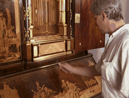 和普通工匠不同的是,除了基本的家具制作外,伦琴父子还掌握了复杂的“细木镶嵌”技法,不通过燃烧、雕刻,而是采用镶嵌的方式表现木质家具上花纹的明暗效果,这也让他得到了当时玛丽皇后的青睐。