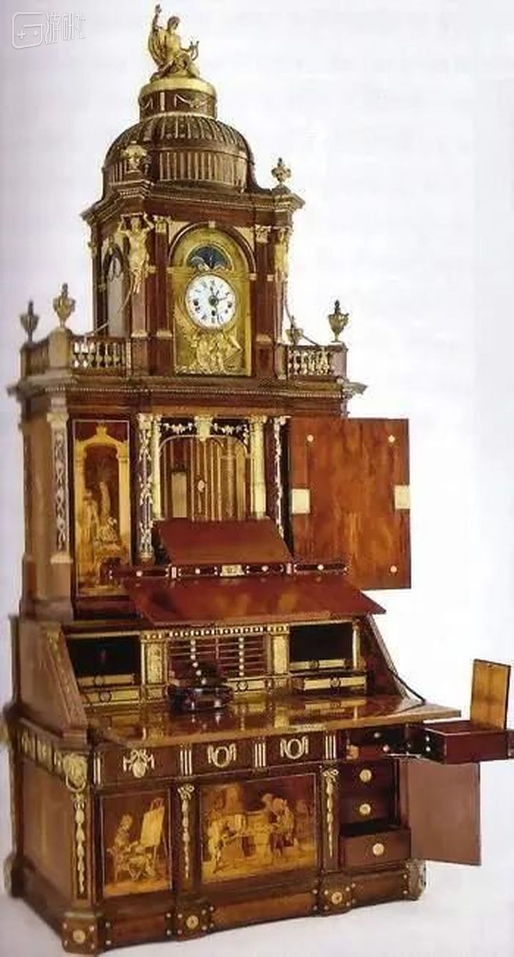 在加上外壳全部由伦琴的“细木镶嵌”技术绘制花纹,使得书柜成为了18世纪欧洲结构最复杂、也是造价最昂贵的家具之一。