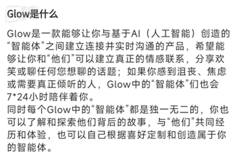 按照官方给出的说法,Glow是一款能够让你与基于AI创造的“智能体”之间建立连接并实时沟通的产品——简单来说就是有智商的电子宠物,专门陪那些闲来无事却又抑制不住交流欲望的网友聊天。