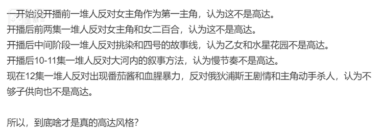 《水星的魔女》前期过于“儿戏”的剧情展开,触及了部分高达老粉的逆鳞。尤其是在本作开播前放送的第0集的衬托下——第0集悲情式的伏笔铺垫以及恶趣味拉满的悲剧式结尾与正片的差别实在太大,不少高达粉丝只得感叹: