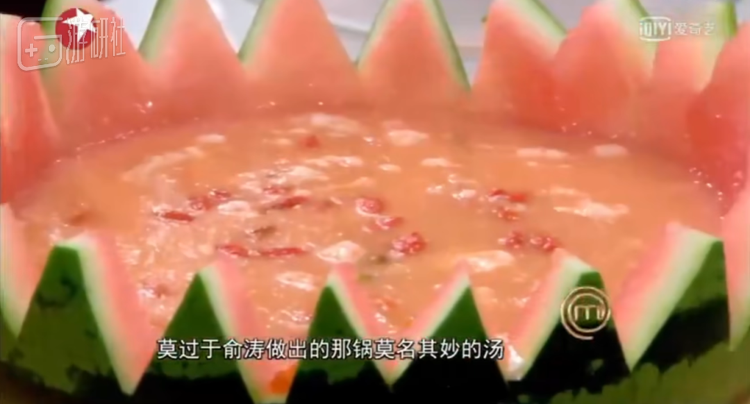 例如这位小胖厨师早在“原味大肠”之前,就先做过一道名为“西瓜枸杞瘦肉汤”的“创新菜”,其色香味看起来都只能以“黑暗料理”来形容,被评委们评价为“莫名其妙”,其他选手则直呼其为“呕吐物”,当之无愧地被评为那期节目的最差菜品。