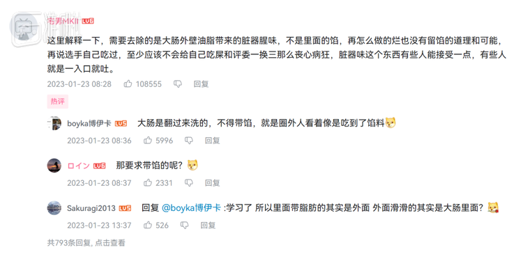 在这个视频的评论区里,关于“原味大肠”的澄清被顶到了最前排——按照常规的清洗方式,肥肠首先会被撕剪开来或是内外翻转(套肠),再加上肠内壁平滑,动物粪便本身很容易就会被清洗干净。