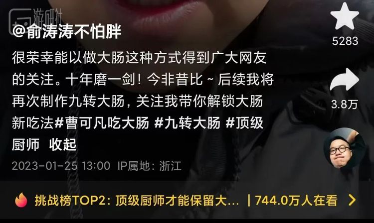 在抖音上,随着“小胖厨师”俞涛本人出面认领,原本似乎受到限流的相关话题也一跃成为了热门。俞涛从两年前开始在抖音上分享自己的做菜视频,而如今,每条视频底下都有着“十年做菜无人问,一朝大肠天下知”的留言。