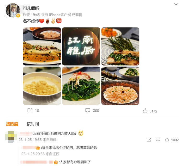 而作为另一名当事者的主持人曹可凡,正如他在节目中的“老饕”人设,向来喜欢在微博上分享一些美食照片。现在,他发布的每一条微博下,都有人不厌其烦地追问他“有原味大肠吗”“怎么不点大肠”“味道和大肠比怎么样”,并通常会被点赞到热评的位置。