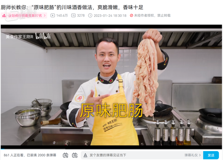 大年初三,在梗走红的第一时间,美食作家王刚就录制了一期《厨师长教你“原味肥肠”》的视频,不出意外成为了他今年以来在B站播放数最高的视频。