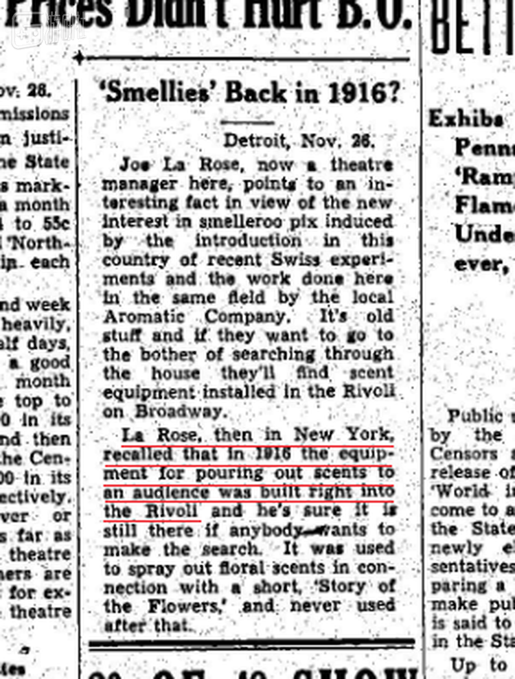 据美国《综艺》(Variety)杂志记载,在1916年有一部叫做《花的故事》的短片上映。为了整点“花”活,纽约里沃利(Rivoli)剧院特地准备了一种向观众喷洒香水的设备,但在放映结束后就再没使用过。