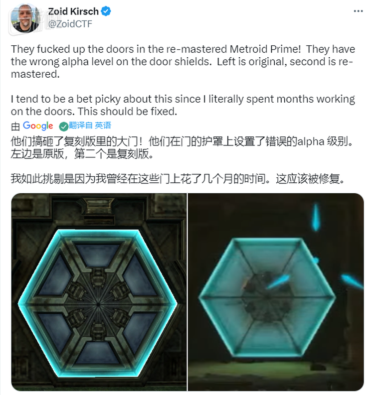 游戏发售当日,曾效力于Retro工作室的游戏开发者Zoid Kirsch在推特上分享了自己对于这款复刻版游戏的感受,尤其是在复刻版中得到史诗级削弱的门,明明游戏内的其他元素都实现了高清化,唯独自己当年亲手制作的门却显得如此寒碜,让他十分不满。