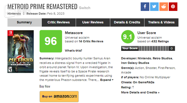 尽管缺少了新游戏应有的宣传造势,但《密特罗德究极 复刻版》还是凭借着优秀的现代化重制与作品本身过硬的素质收获了媒体与玩家的一致好评。在评分网站Metacritic里,本作的媒体评价与用户口碑居高不下,颇有冲击年度游戏之势。