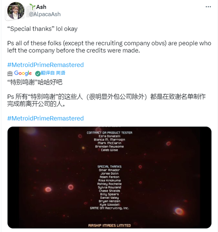 实际上这并不是《密特罗德》系列头一回在致谢名单这方面出问题,早在《密特罗德 生存恐惧》发售期间,一位参与项目11个月的3D建模师也没有在游戏中找到自己的名字。当时的游戏开发商水银蒸汽表示只有参与游戏开发周期25%的员工才有资格出现在致谢名单里,《密特罗德生存恐惧》的开发周期为4年,因此工作时长超过12个月的员工才能被写入职员表。如今看来,Retro工作室大概也沿用了这套规则,忽略了那些参与了原版的老员工的名字。