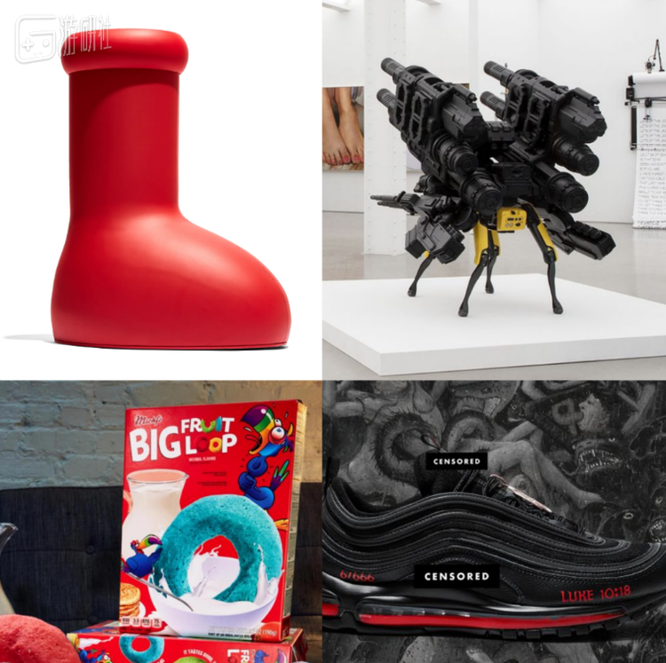 而作为他们的对手,MSCHF也有着离经叛道的风骨。向前回顾,他们的创造履历上,都是各种稀奇古怪的艺术商品,比如以阿童木和撒旦为题的鞋子,全副武装的机械犬,以及大到碗都放不下的水果圈等。