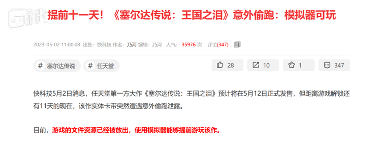 即便游戏媒体对相关讯息避而不谈,其他有关无关的媒体仍会推送 “《王国之泪》已被破解”的消息, 甚至还会将“模拟器可玩”标红,就仿佛这是什么值得四处奔告的打折讯息。