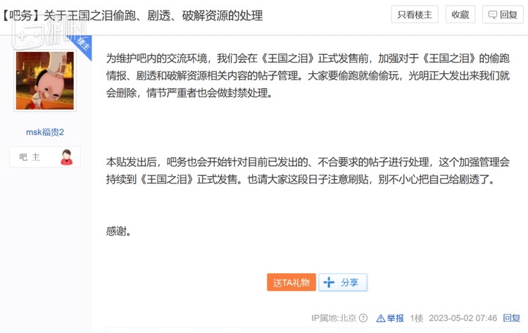 如今在百度“塞尔达传说吧”,吧主将《关于王国之泪偷跑、剧透、破解资源的处理》的帖子挂到了置顶,尽管禁止了用户们在吧内发布相关内容,但吧务团队还是在文中表达了一些态度“大家要偷跑就偷偷玩”。