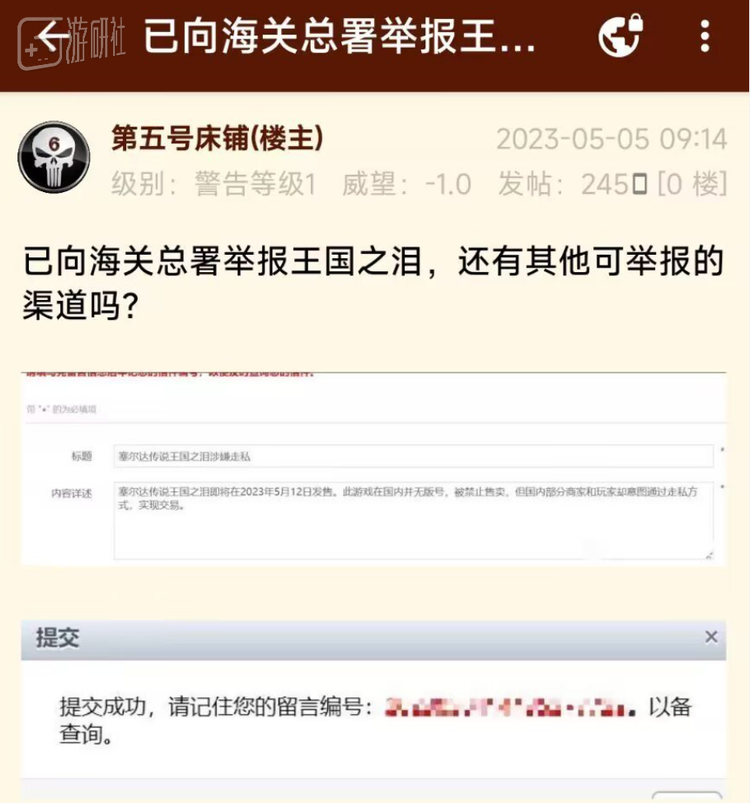 在贴吧和NGA,都有用户声称自己发动了“核武器”,已向海关总署举报《王国之泪》涉嫌走私,言下之意:“看不起玩盗版?那正版也别想玩了!”