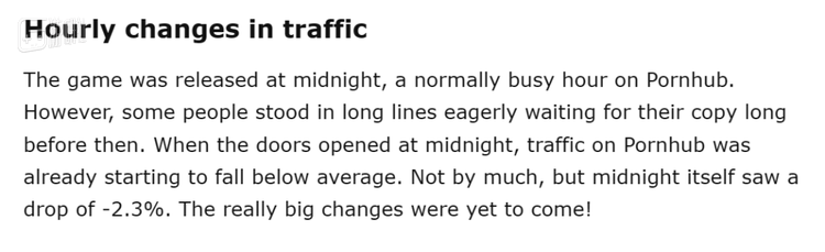 值得一提的是,Pornhub特意提及了游戏发售对网站的影响,通常来说,寂寞的午夜时分是这家成人网站的高峰期, 不过在《王国之泪》解锁的那个晚上,网站流量开始低于平均水准,出现了2.3%的降幅,而Pornhub将原因归结为“人们站在长队中急切地等待他们的游戏”。