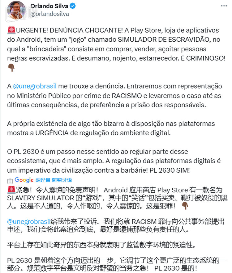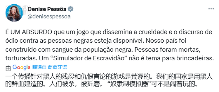 巴西劳工党议员德尼斯·佩索阿(Denise Pessoa)也在推特上表示:“在一个种族主义是犯罪的国家,一个传播残酷和仇恨言论的游戏是不可接受的。我们国家是用黑人人民的鲜血建立起来的。人们被杀害、折磨。‘奴隶模拟器’可不是玩笑。”