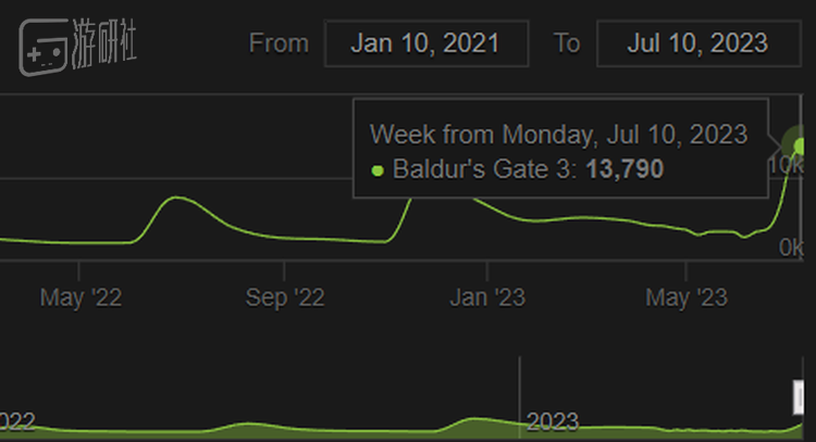 当然如此展示,除了直播得承担点风险,效果还是好的——打开STEAMCHARTS你就能直观感受到,过去几十个小时里诞生了多少对拉瑞安艺术理念感兴趣的新玩家:游戏EA版的在线人数已经达到了过去两年来最高水平。