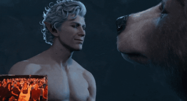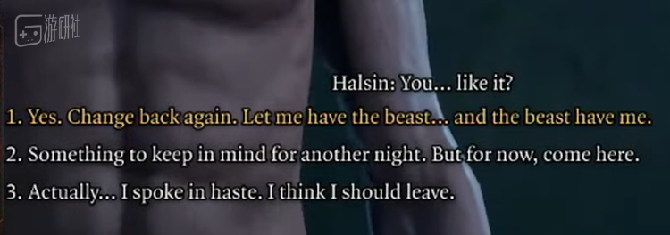 而考虑到《博德之门》本身的玩法,官方在直播展示中选择尊重在场观众的要求来进行对话选择——当阿斯代伦与哈尔辛正在调情时,哈尔辛突然失控变成了熊,此时阿斯带来的对话出现了数个选项,而其中看起来最刺激的,则是阿斯代伦要求哈尔辛以熊的姿态继续接下去的行为。