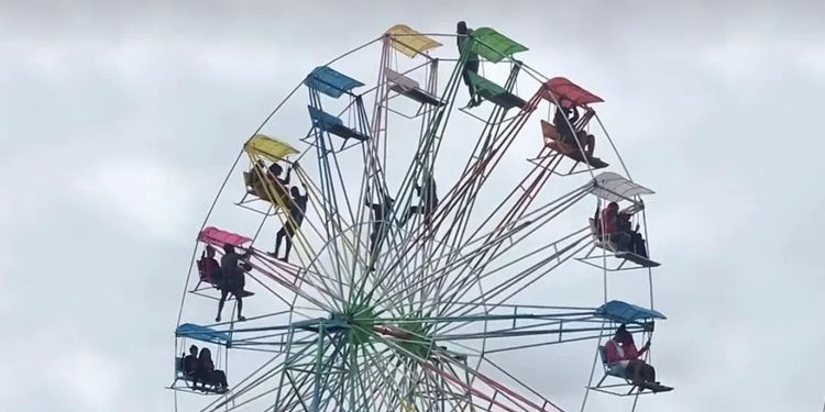 等到有游客光顾,这群小伙子还会先摊主一步围上去推销。一旦客人坐稳,他们又再次有组织地爬上摩天轮的架子,开开心心地玩起了重心马戏,担下了为摩天轮“发电”的重要任务。
