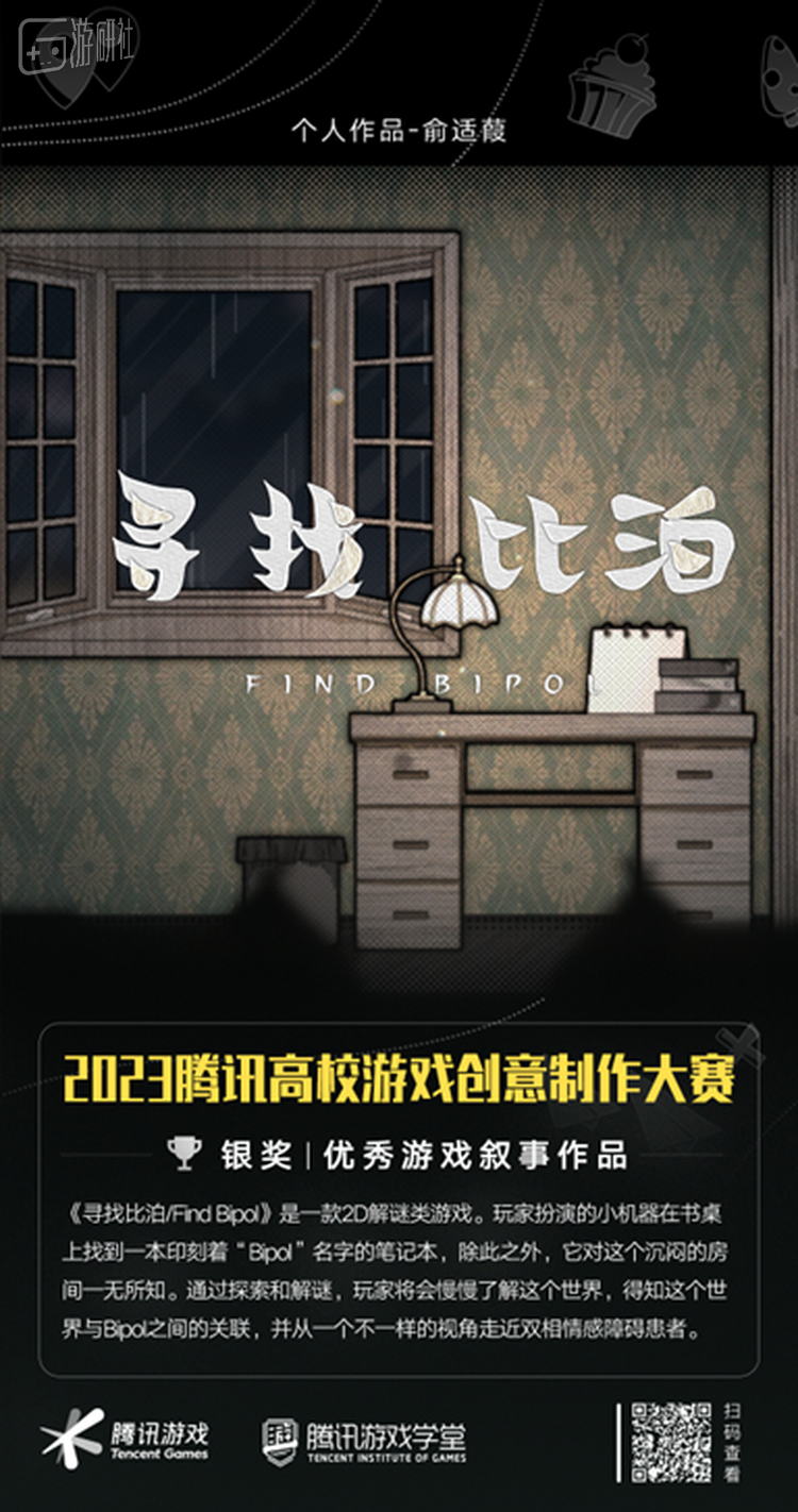 来自上海大学的同学制作了一款探索双相情感障碍患者内心世界的2D解谜类游戏《寻找比伯(Find Bipol)》。玩家扮演的小机器人,通过在场景中漫游与收集线索,破解谜题,慢慢了解所在世界的真相。该游戏希望通过新颖的视角,对双相患者的内心世界作出诠释,加深大众对双相情感障碍的理解,从而消除因缺乏认识而造成的理解壁垒。