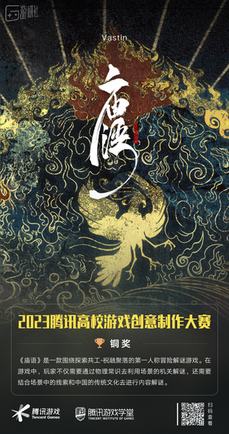 《庙语》是一款围绕探索共工-祝融聚落的第一人称冒险解谜游戏。来自仲恺农业工程学院的同学们讲述了一个通过古建筑沟通时今,连系父女两代人与文保的故事。 玩家将以第一人称视角带入主角身份开启历险,在水神庙的线索和机关中,实现与古人跨越千年的对话,感受和理解他们的美学与智慧。