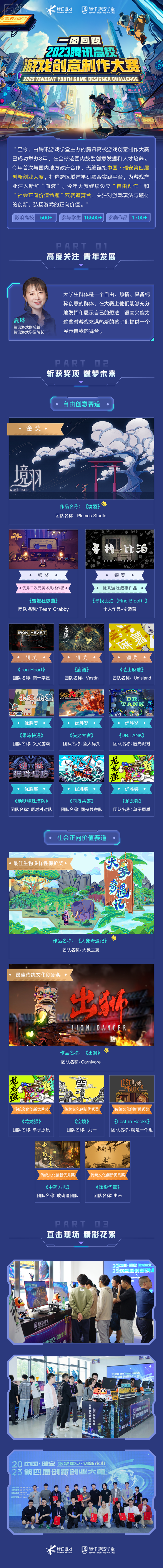 自2015年以来,腾讯高校游戏创意制作大赛一直以培养未来游戏制作人为宗旨,与众多海内外心怀游戏制作梦想的高校学子们共同探索游戏的多元价值。截止目前,大赛已经举办了九届,累计直接影响高校500+所,参与学生16500+名,累计收到作品1700+款,诞生了一批弘扬游戏正向价值的优秀游戏作品。包括登上联合国气候变化大会的《荒原林海》、融合民间传统皮影艺术与神话传说的作品《影迹》等。