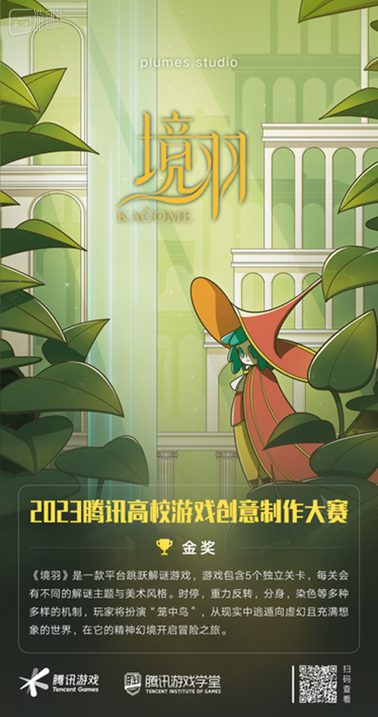 作为一款平台跳跃解谜游戏,《境羽》创造性地采用了去文字化的环境叙事与演出,通过意向与场景氛围传递情感。来自中国传媒大学、北京科技大学的同学以“笼中鸟”为关键词展开联想,设计了主人公“羽”,让玩家在进行解谜的过程中,也能体会到追求自由理想的可贵。