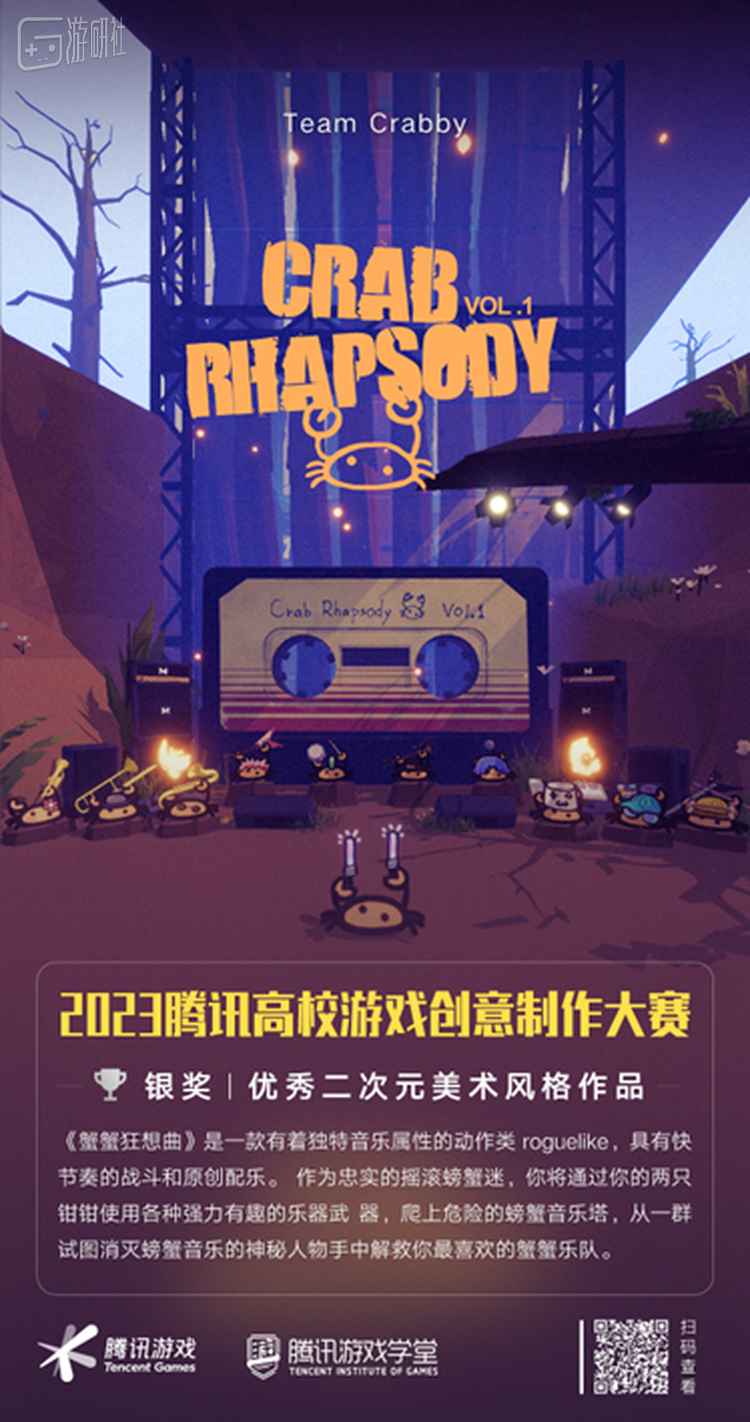 《蟹蟹狂想曲》是一款有着独特音乐属性的动作类Roguelite游戏,拥有着快节奏的战斗和原创配乐。来自美国南加州大学等海外知名高校的同学让玩家化身忠实的摇滚螃蟹迷,通过使用各种强力有趣的乐器武器,从神秘人物手中解救最喜欢的蟹蟹乐队。在游戏过程中,玩家可以体验到即兴演奏各种乐器的乐趣。