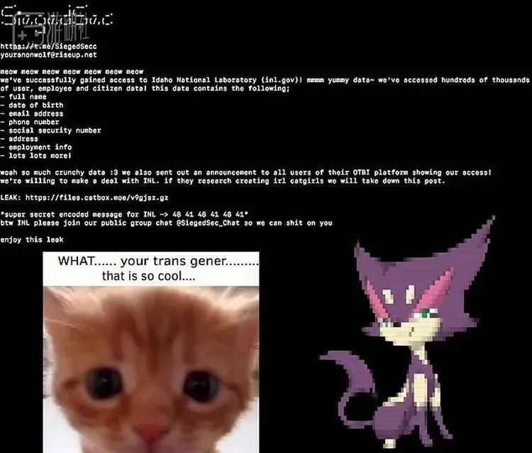 帖子这样写道:“喵喵喵喵喵喵喵(原文如此),我们已经成功进入了INL。嗯,美味的数据~我们已经得到了数十万名用户、员工和公民的数据。”