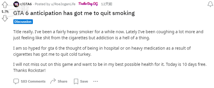 要知道,距离GTA5上线已经十年过去了,近年来网上围绕续作有过泄露,有过争论,有过遐想也有过看不到尽头的等待。甚至不久前还有网友表示,自己身体似乎每况愈下,他担心没法健康等到GTA6发售,因而开始自律戒烟。