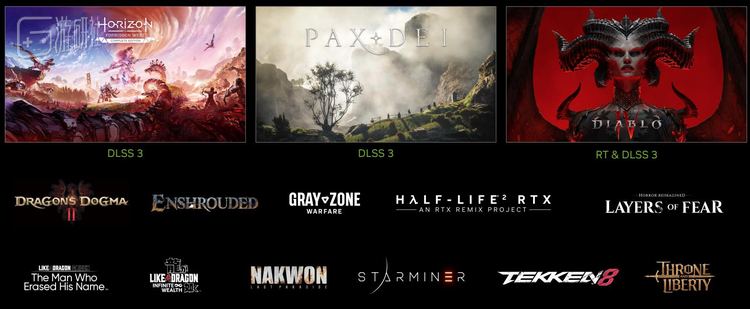 目前支持RTX的游戏和应用已经超过了500款,这些游戏的玩家就已经感受到了AI在画面观感提升上的强大指出。这次的CES上,《暗黑破坏神4》也宣布将在3月支持DLSS 3或光追,《地平线:西部禁区》等游戏也会相继加入支持RTX的列表里,持续扩充这个阵容。