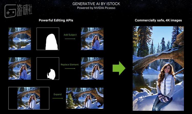 比如同样是在CES上发布的iStock生成式AI工具,基于NVIDIA Picasso定制AI模型生产服务,通过可授权素材提供了一个文本到图像的快速生成工具。