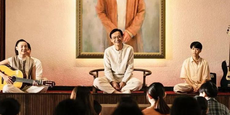 这是最近上映的电影《周处除三害》里的一首歌。听起来挺励志的,但它出现的场景却是在一个邪教的灵修堂里,伴随着四溅的血浆和爆头的枪声响起。