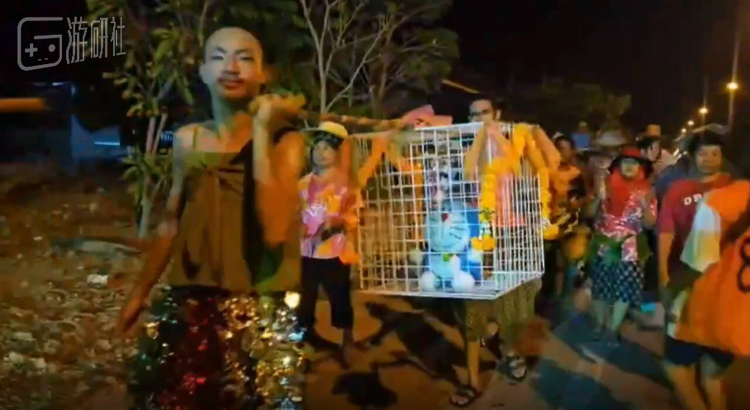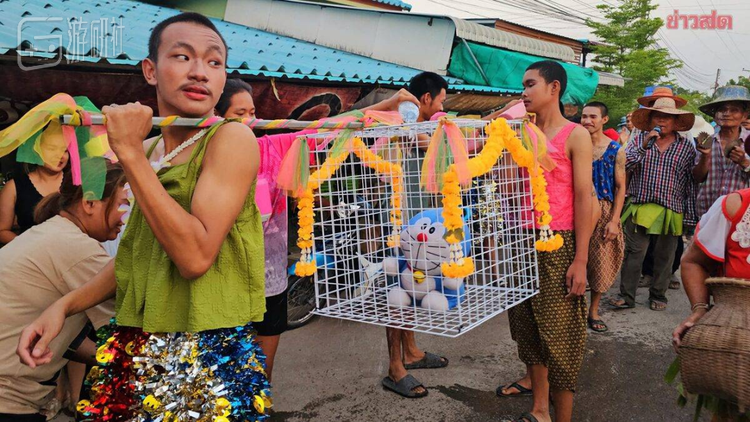如此诡异的场景,不久前发生于泰国的一个小村庄。但这并非是经典动漫《哆啦A梦》相关的宣传活动,而是一场古老而朴实的传统仪式: