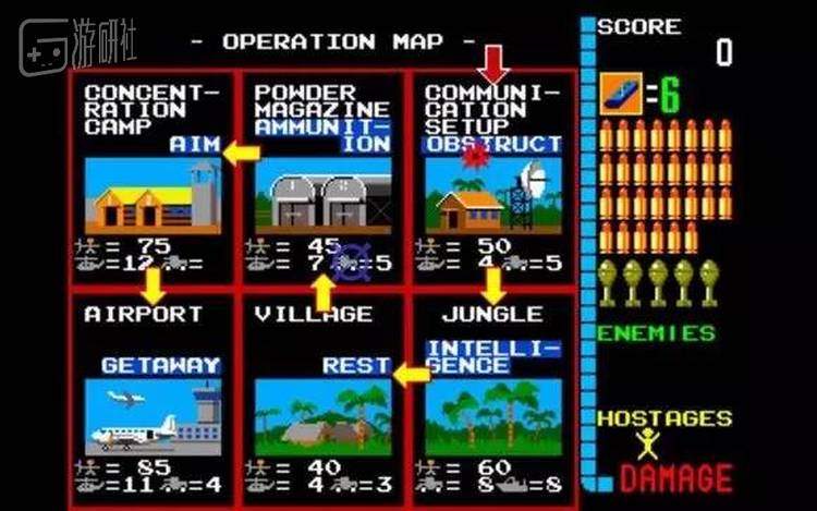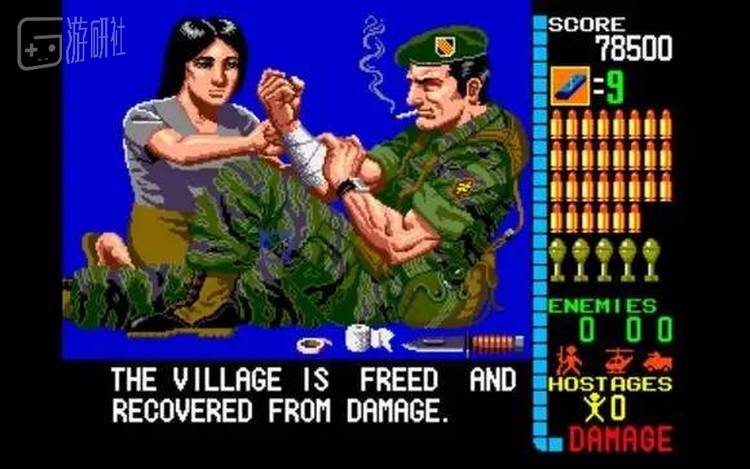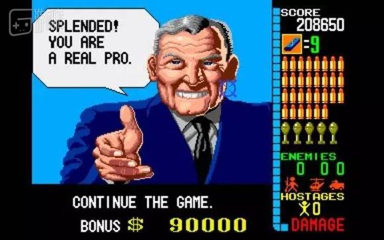 第六关玩家需要掩护五名人质登上美国空军的C-130运输机,最终Boss则是一架苏制“米-24雌鹿”武装直升机,通关之后,你会受到上级的表彰,并获得积分,然后游戏进入二回目,这也是街机里比较少见的。