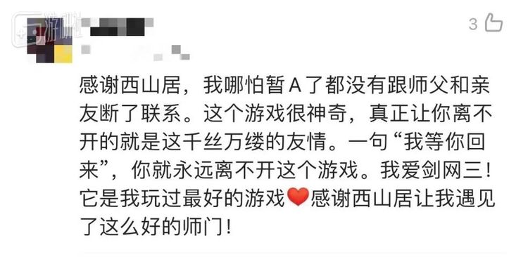 事实上,这的确也是西山居的企业文化。他们将“成为游戏玩家的圣地”写进了公司发展愿景里,并且始终在和玩家做共鸣,举办《剑网3》电竞赛、召开同人嘉年华……西山居用玩家喜欢的方式和玩家站在一起,玩家自然也会与公司形成双向的情感交流。