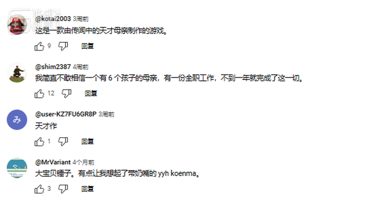 不少玩家眼里,《RunRun超级英雄宝贝》不仅画风令人眼前一亮,操作手感的调校也可称老道。当他们发现背后竟然是一位从零自学的开发者,同时还养育着六个孩子时,“天才母亲”的称呼充斥了游戏的评论区。