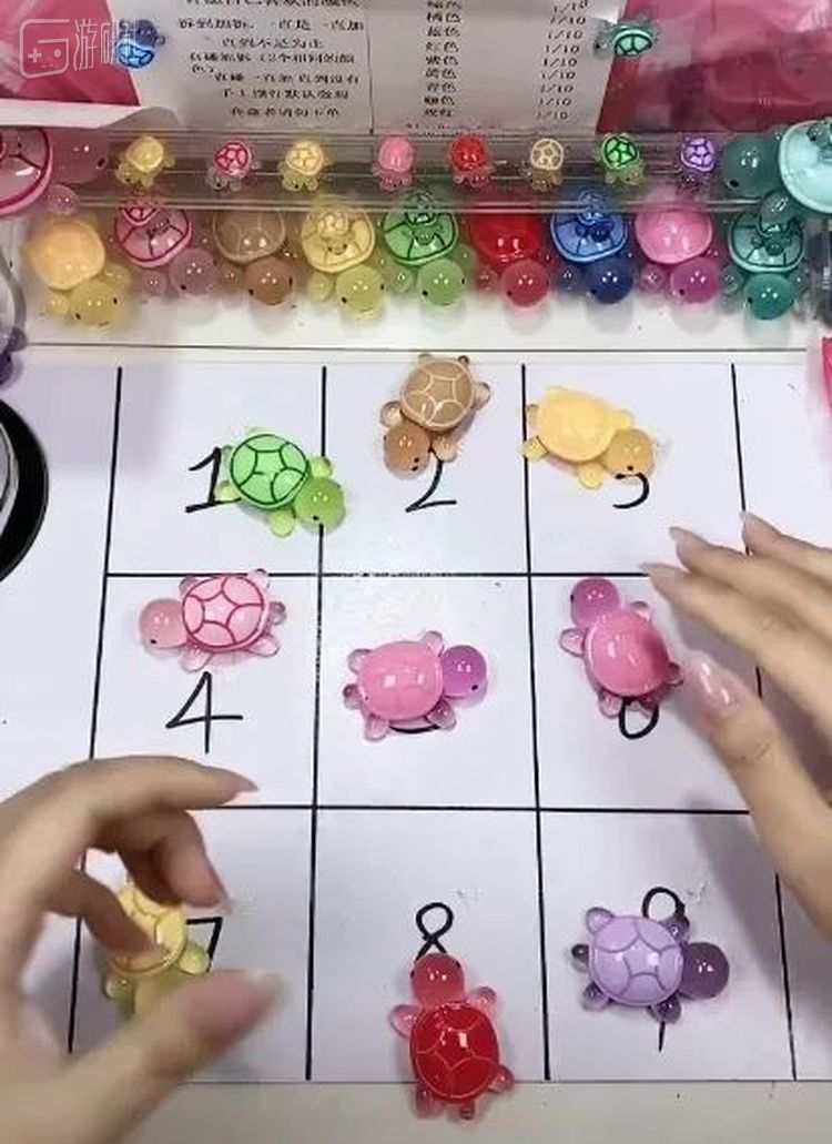 在镜头前方,桌子上放着一张画有九宫格的白纸,每拆出一个乌龟,就把它放到其中1格里。填满9格后,每出现一对相同颜色的乌龟,就把它们拿到一旁“消掉”,并再送一包;开出一条线上的3只同色,再送5包;九宫格凑齐全部9种颜色,也会送出5包。就这样拆完所有购买和赠送后的乌龟盲盒后,开出的所有乌龟摆件都会打包寄给买家。