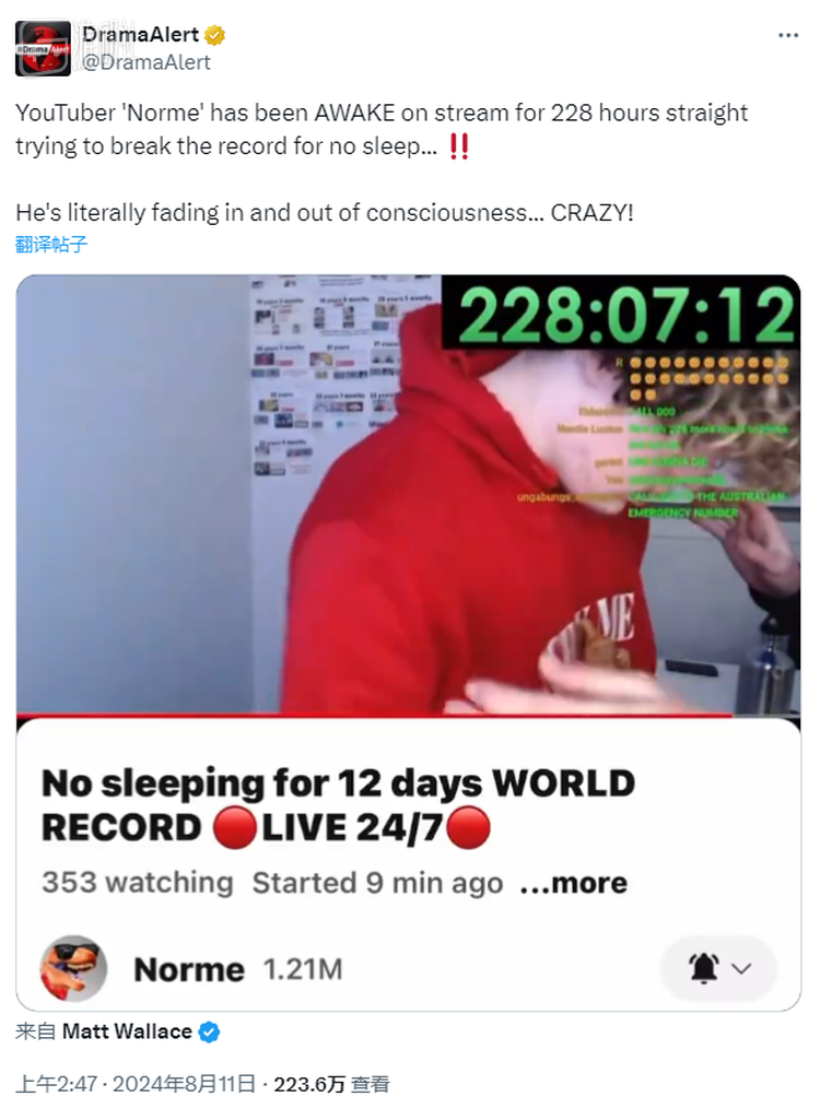 和往常一样,Norme最初开播时并没有太多观众,直到直播持续到220小时,他才引起观众们的注意——此时的Norme开始说胡话,出现幻觉,几近昏迷,一位博主将他的切片发在X,收获了220万次观看。